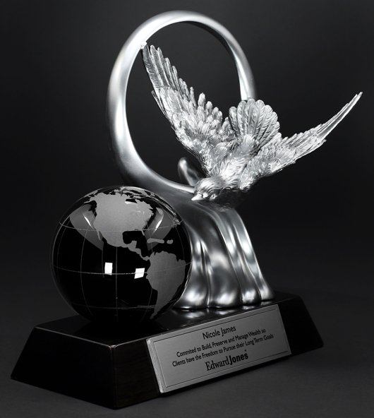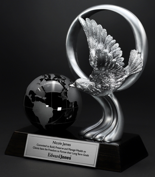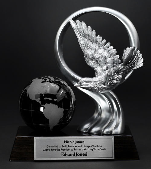 The Dove Endurance award statue is a Highly Detailed hand crafted Dove sweeping over the solid black crystal globe for a Modern Award that leaves an Impression - Showing great appreciation for those who are committed to accomplishing long term achievements.